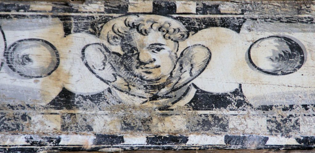 Es gibt zwei oder drei Handlungsräume, (a) den des Krieges in Sachsen. Dort kämpfen der Schwedenkönig samt seinem Baron und sie scheinen über die katholischen Kräfte („Päpstliche“) zu triumphieren, dann  (b) gibt es den  Lebensraum des Barons, die Halle, in der die Decke mit Bildern bemalt ist: Baron, Ehefrau, Sohn, Totenschädel, IHS-Signatur. Und in dem der Abwesende, der „Hausherr“,  wüst gefeiert wird. Obwohl – das signalisiert das adversative „doch“ in der fünften Strophe – Kriegsgräuel gegenüber Bauern und Bäuerinnen begangen werden. Eine unstatthafte, eine unangemessene Huldigung für den Baron, so können wir aus dem „doch“ herauslesen. Einem spärlichen Signal des Kommunikationsraumes.